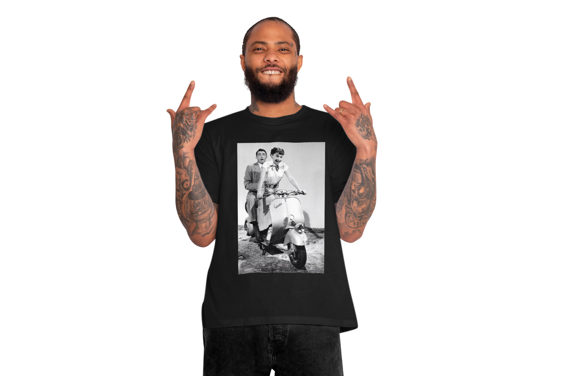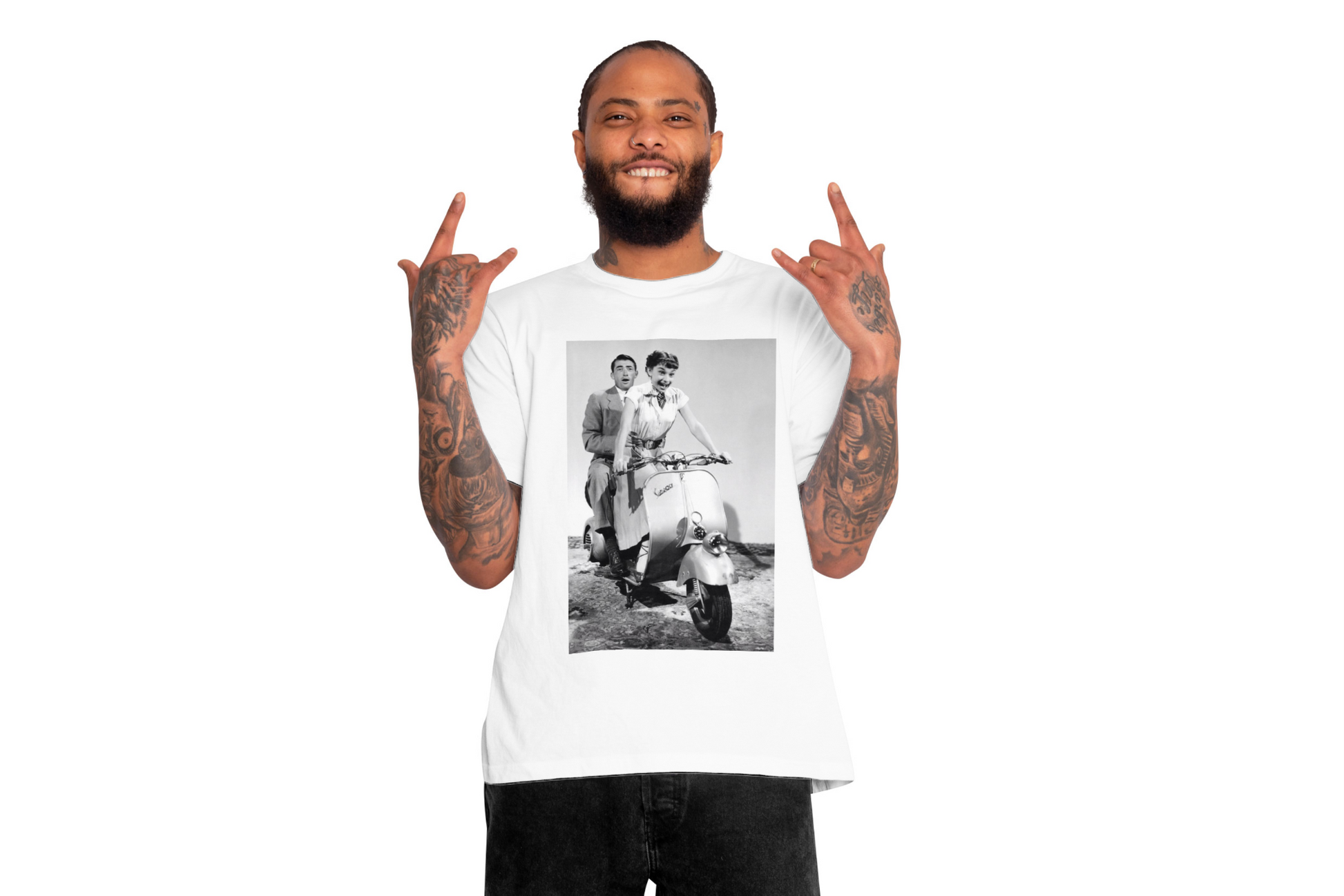 Íconos como Paul Newman, Brad Pitt o Audrey Hepburn en Vespa vuelven a vivir en camisetas que huelen a cine, libertad y estilo sin fecha de caducidad 🛵🎬