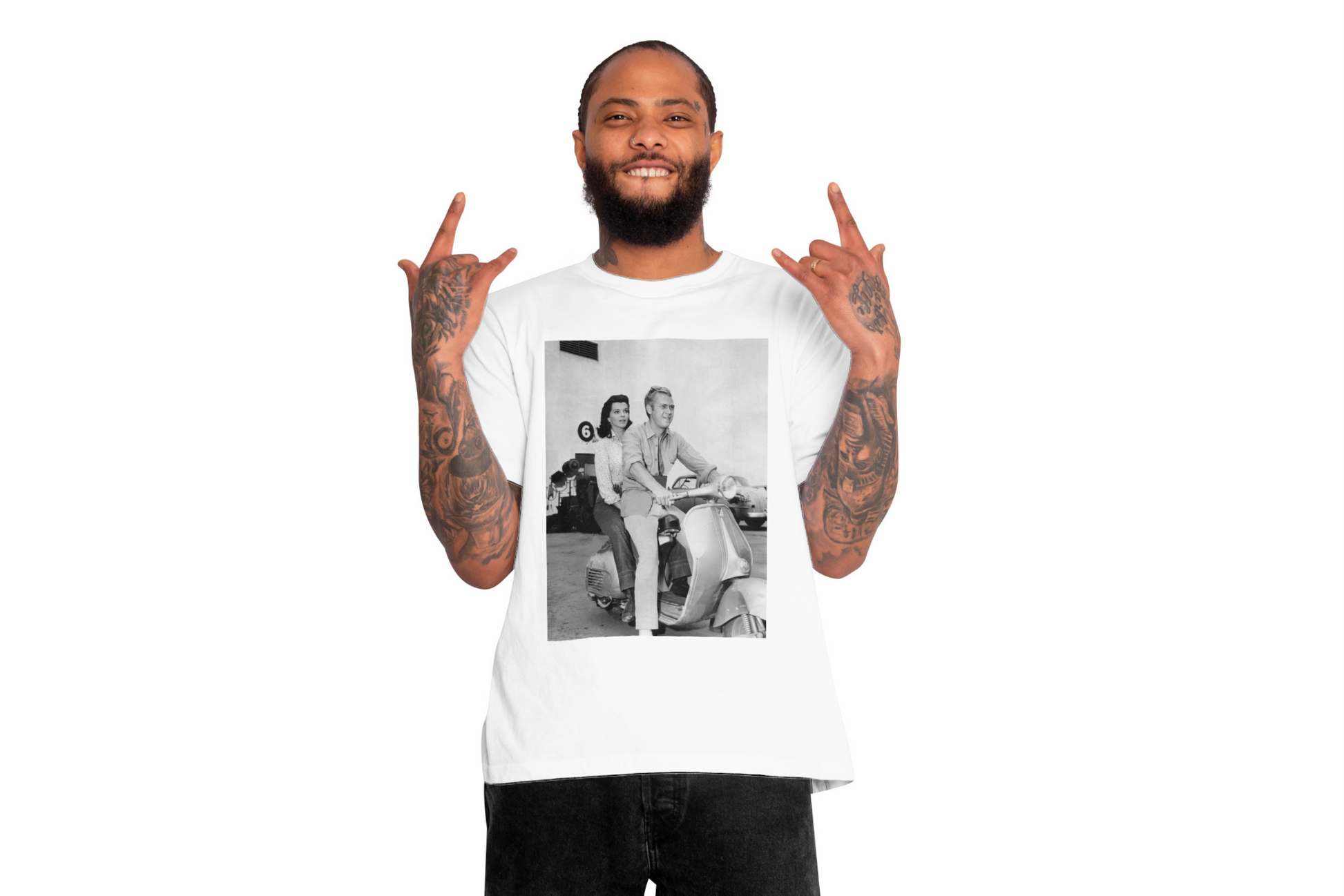 Íconos como Paul Newman, Brad Pitt o Audrey Hepburn en Vespa vuelven a vivir en camisetas que huelen a cine, libertad y estilo sin fecha de caducidad 🛵🎬
